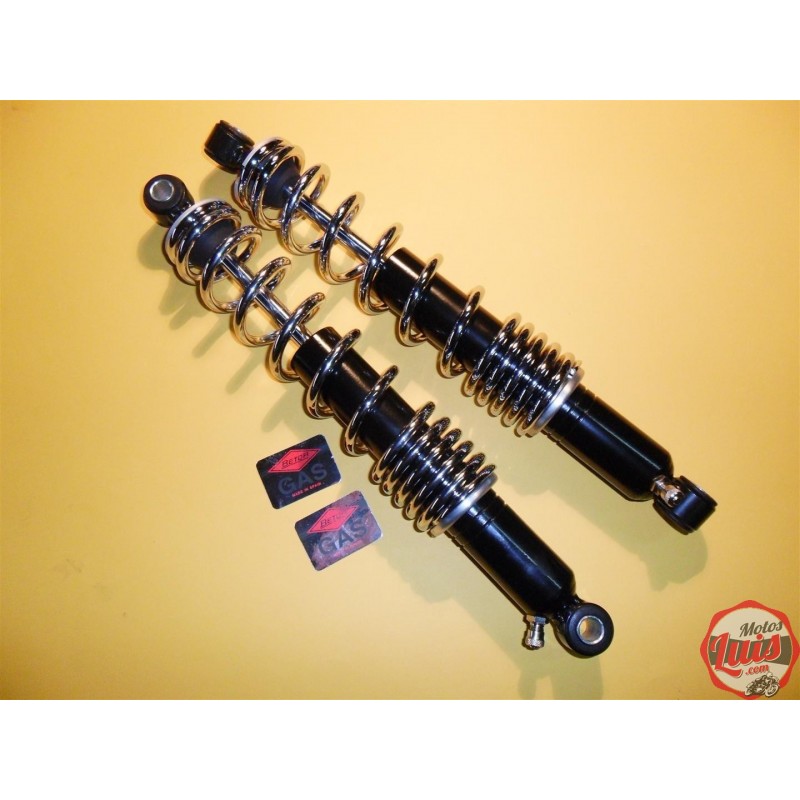 JUEGO DE 2 AMORTIGUADORES DE GAS CON CUERPO NEGRO, MUELLE LARGO NEGRO Y MUELLE CORTO AZUL CON RACOR, 380 MM DE DISTANCIA ENTRE CENTROS DE AGUJEROS, MONTADOS EN BULTACO FRONTERA Y PURSANG. NUEVOS.