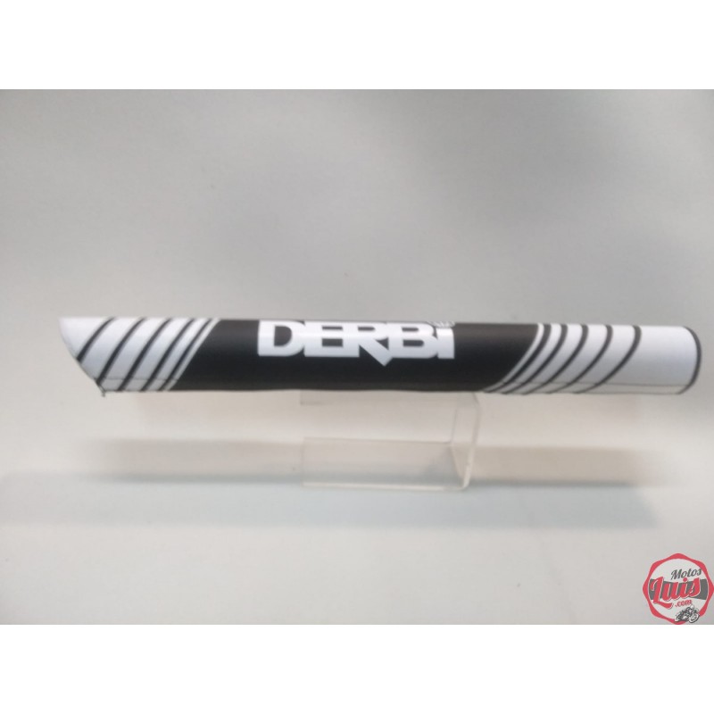 Protector de barra de chasis para DERBI Variant Sport R, realizado en material blanco con serigrafia en color negro. Calidad superior, velcro y cosido de gran resistencia, SIN AGUJERO para modelos replica.