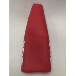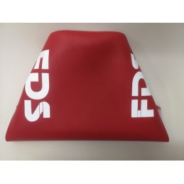 Funda de asiento para DERBI Variant, para modelos con asiento plano por la parte superior. Combinado con tela negra en dos piezas con serigrafia en COLOR ROJO. Lista para montar sobre la espuma original.