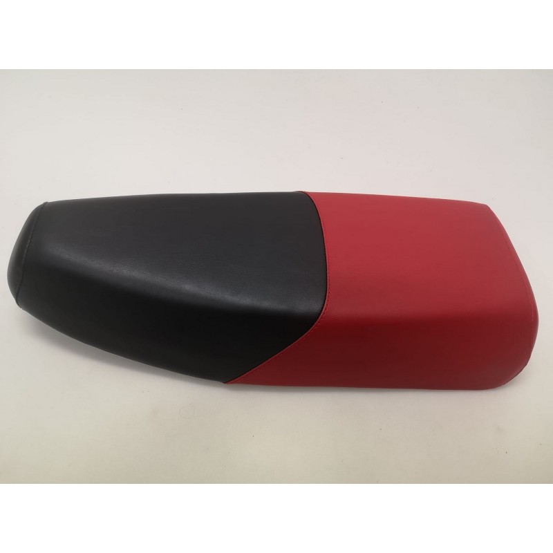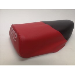 Funda de asiento para DERBI Variant, para modelos con asiento plano por la parte superior. Combinado con tela negra en dos piezas con serigrafia en COLOR ROJO. Lista para montar sobre la espuma original.