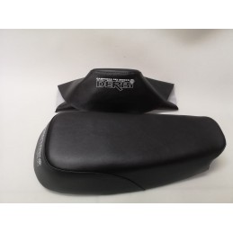 Funda de asiento para DERBI Variant, para modelos con asiento plano por la parte superior. Combinado con tela negra en dos piezas con serigrafia en blanco, identica a la original, lista para montar sobre la espuma original.