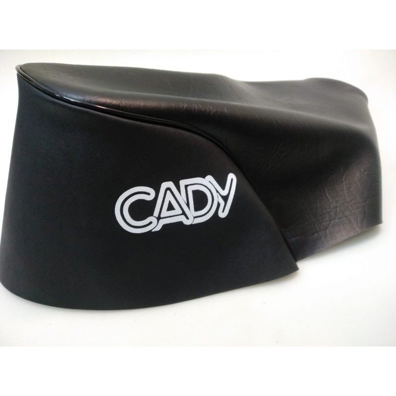Funda de asiento para Mobylette Cady, en negro y blanco con letras en color negro, realizada con el mejor material y con serigrafia en los laterales.
