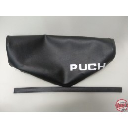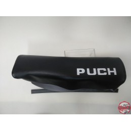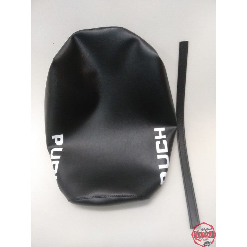 Funda de asiento para Puch Dakota 2ª Serie en color negro, con serigrafiado blanco con la marca en la parte trasera. Identica a la original. NUEVA. Lista para montar. SERIGRAFIADA