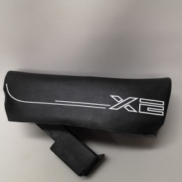 Funda de asiento para Vespino XE en NEGRO con SERIGRAFIA en color ROJO. De nueva fabricacion se adapta al asiento original puesto que tiene el mismo patronaje, para instalarla es necesario desmontar el tapizado original y sustituirlo. La fijacion recomendada es como la original, en este caso con pegamento de contacto.