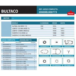 Juego de juntas para Bultaco Mercurio y Metralla MK2. Validas para los siguientes modelos de bultaco:Mod.23-Metralla MK2Mod.26-Matador MK3Mod.27/49-SherpaTMod.28/57/79-Campera MK2Mod.42-Pursang MK2Mod.44/45-Sherpa S175/200Mod.66/67-Sherpa S175/200 MK2Mod.48/68-Pursang 250 MK3/MK4Mod.76/77-Lobito 175/200 MK4Mod.80/91-Sherpa T250Mod.85-Alpina...