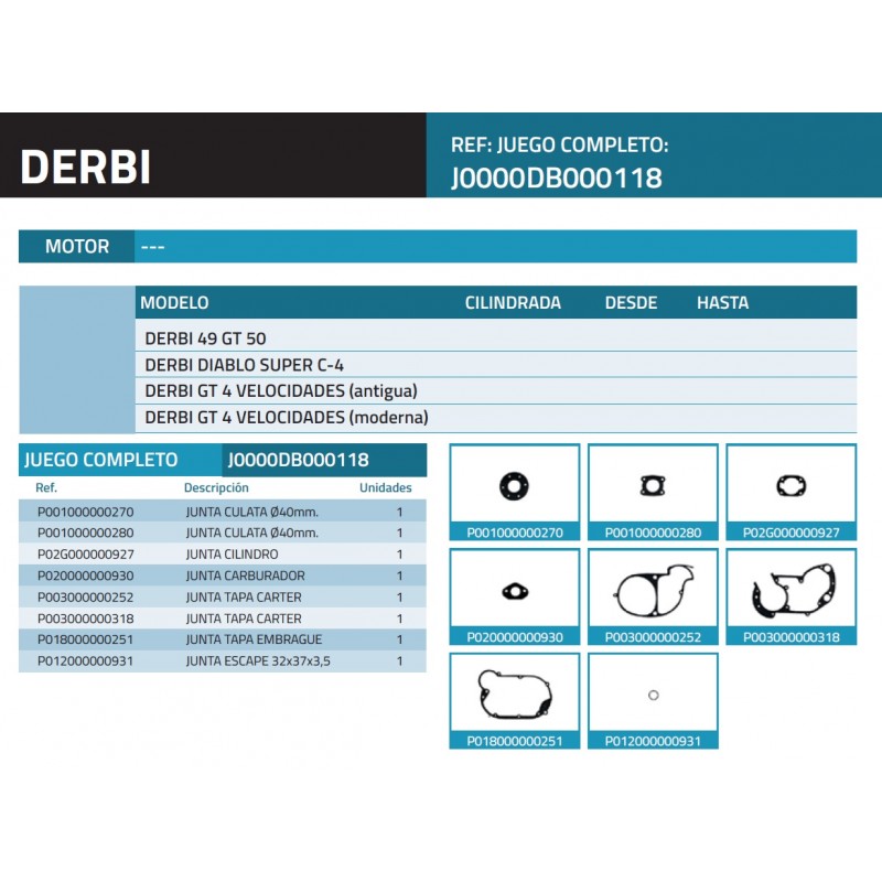 Juego completo de juntas adaptable a Derbi Antorcha y Derbi Coyote, recomendamos comprobar el perfil de las juntas puesto que hay muchas variantes de motores de derbi.