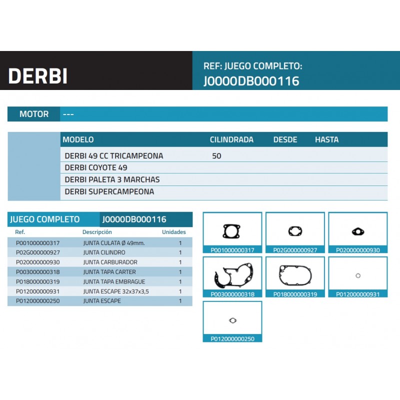 Juego completo de juntas adaptable a 49 Tricampeona 3 VELOCIDADES, recomendamos comprobar el perfil de las juntas puesto que hay muchas variantes de motores de Derbi.