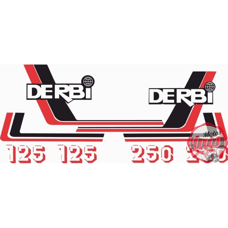 Kit de adhesivos motos clasicas para DERBI RC, juego valido para la version de 125 y de 250. Con letras en rojo y blanco. Juego Pegatinas Completo - Vinilo para Moto, máxima Calidad.