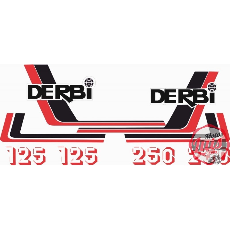 Kit de adhesivos motos clasicas para DERBI RC, juego valido para la version de 125 y de 250. Con letras en rojo y blanco. Juego Pegatinas Completo - Vinilo para Moto, máxima Calidad.