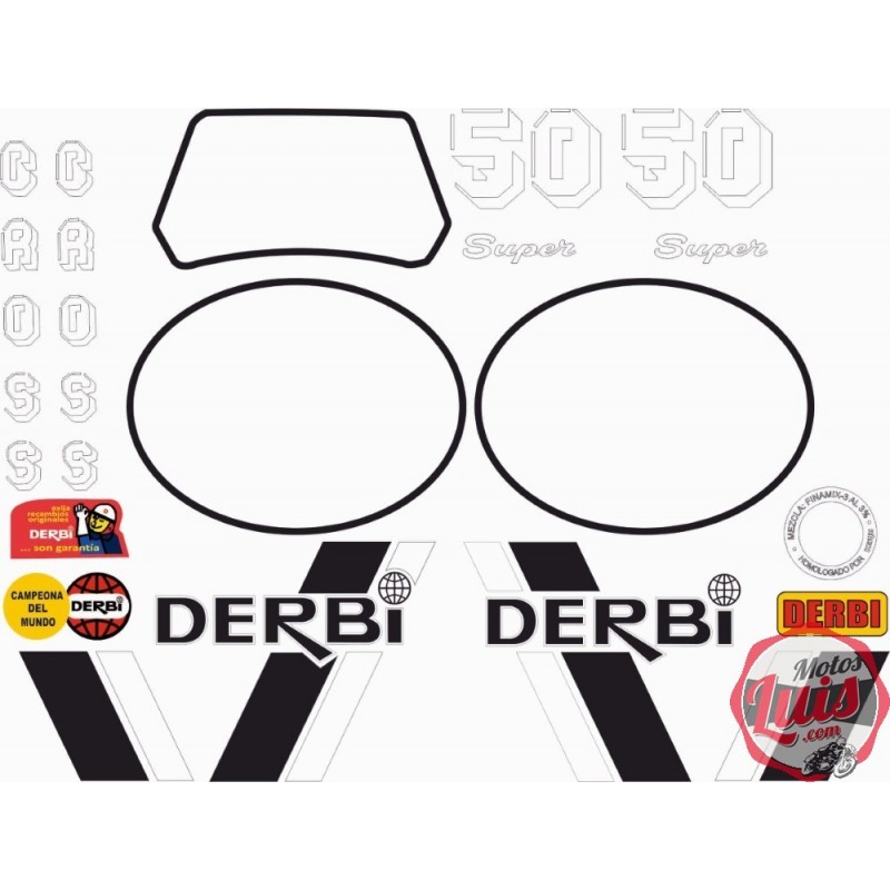 Kit de adhesivos motos clasicas para DERBI RC, juego valido para la version de 125 y de 250. Con letras en negro y blanco. Juego Pegatinas Completo - Vinilo para Moto, máxima Calidad.