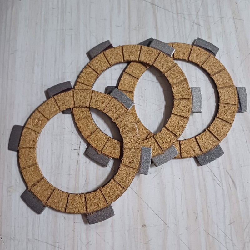 Juego de discos de embrague de fibra adaptables a Bultaco Chispa y Ducati 49 y motos con el mismo motor. Compuesto de 2 discos con almenas interiores y fibra en ambas caras, 1 disco con almenas exteriores y fibra en una cara, 1 disco con almenas exteriores metalico.