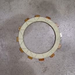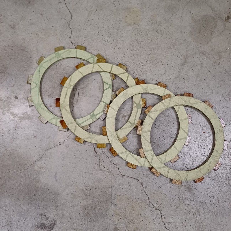 Juego de discos de embrague de fibra adaptables a Bultaco Chispa y Ducati 49 y motos con el mismo motor. Compuesto de 2 discos con almenas interiores y fibra en ambas caras, 1 disco con almenas exteriores y fibra en una cara, 1 disco con almenas exteriores metalico.