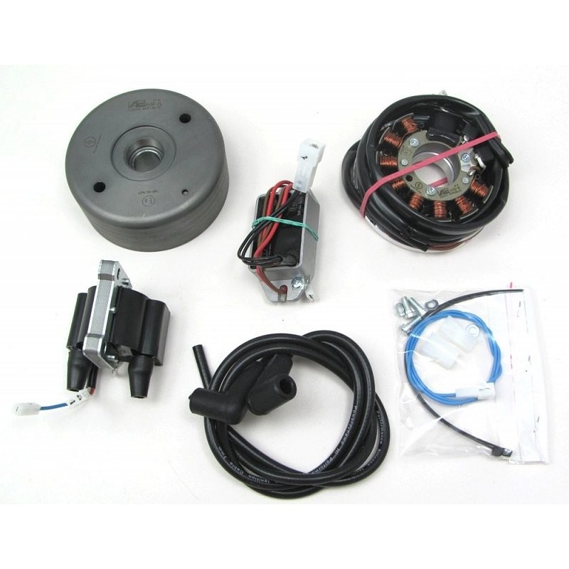 Encendido electronico completo para convertir completamente la moto a 12 voltios. NUEVO Para modelos de OSSA 160, 175 y 230 cc. NUEVO Incluye: Estator Rotor Bobina de alta Regulador/estabilizador de corriente Extractor Claxon 12 voltios Bujia y lamparas de cortesia Instrucciones y esquema de montaje