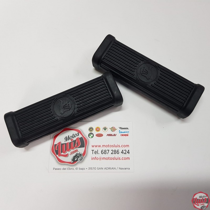 Juego de dos gomas de estriberas para Moto Guzzi 49, Moto Guzzi 65 y Moto Guzzi 73, para soportes de estribera tipo "cuchilla" con la leyenda "Moto Guzzi" grabada en el extremo de las mismas. Precio de la pareja