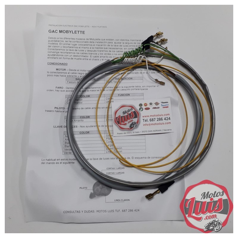 Instalacion electrica completa para MOBYLETTE, realizada con funda GRIS, valida para todos los modelos. respeta los colores originales, valida para Modelos con chasis tipo Hombre (campera) o tipo Mujer (AV-88 y Cady). Incluye todos los conectores necesarios.
