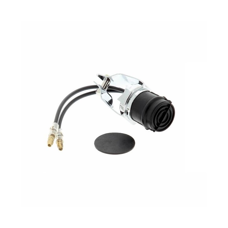 Interruptor de freno TIPO LUCAS para anclar en el chasis gracias a sus dos orejetas de fijacion y con enganche para abrazar en la varilla en el extremo del muelle. La parte negra tiene dos lengüetas para sujetar en el chasis o en una placa plana al efecto y la punta del muelle se amarra a la varilla de freno.