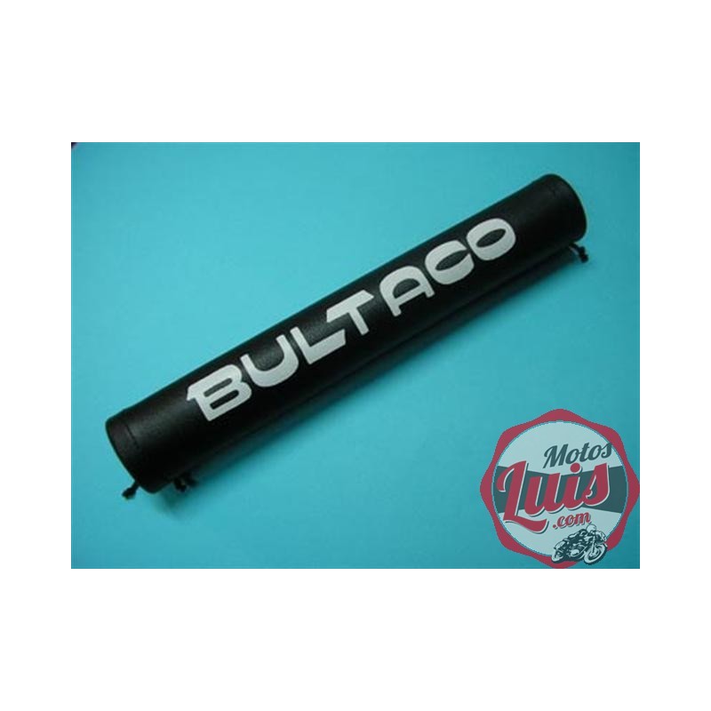 Protector de manillar de BULTACO en color negro, con letras en blanco, de calidad superior, con cordones de ajuste en los extremos, velcro y cosido de gran resistencia.