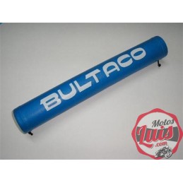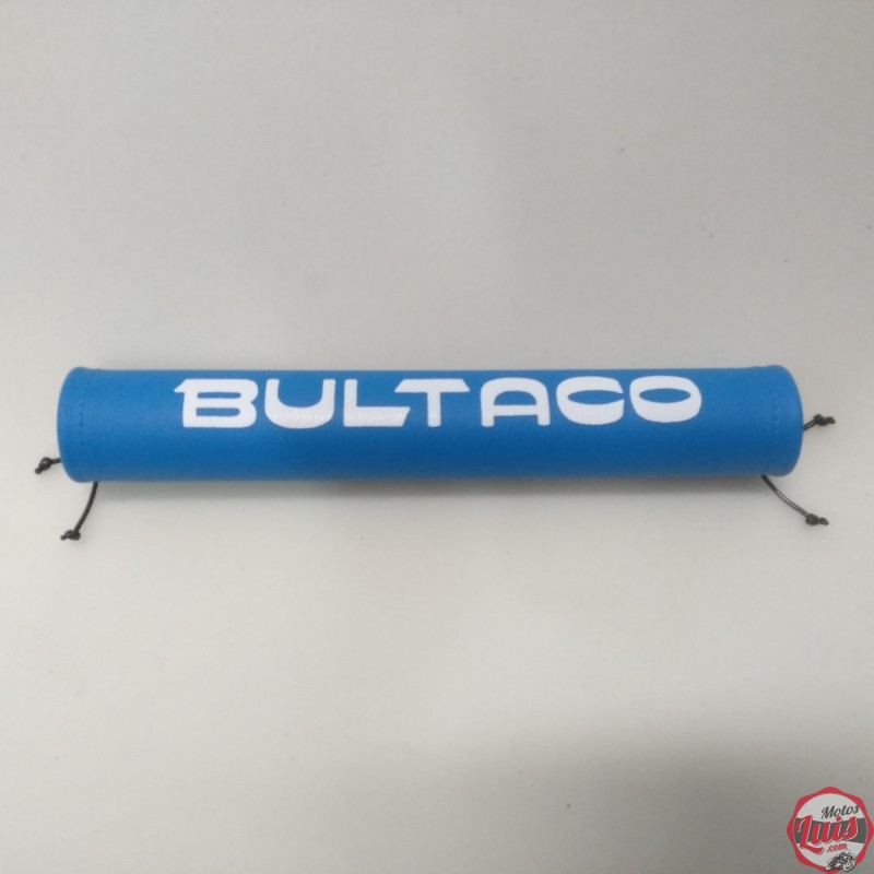 Protector de manillar de BULTACO en color azul, con letras en blanco, de calidad superior, con cordones de ajuste en los extremos, velcro y cosido de gran resistencia.
