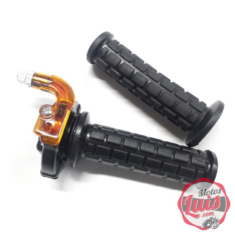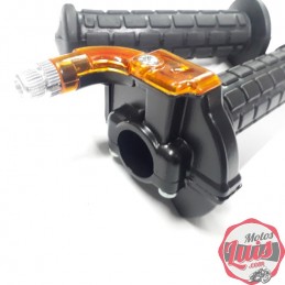 PUÑO DE GAS DE SALIDA LATERAL CON TAPA DE PLASTICO TRANSPARENTE AMARILLA, IDEAL PARA MOTOS DE TRI