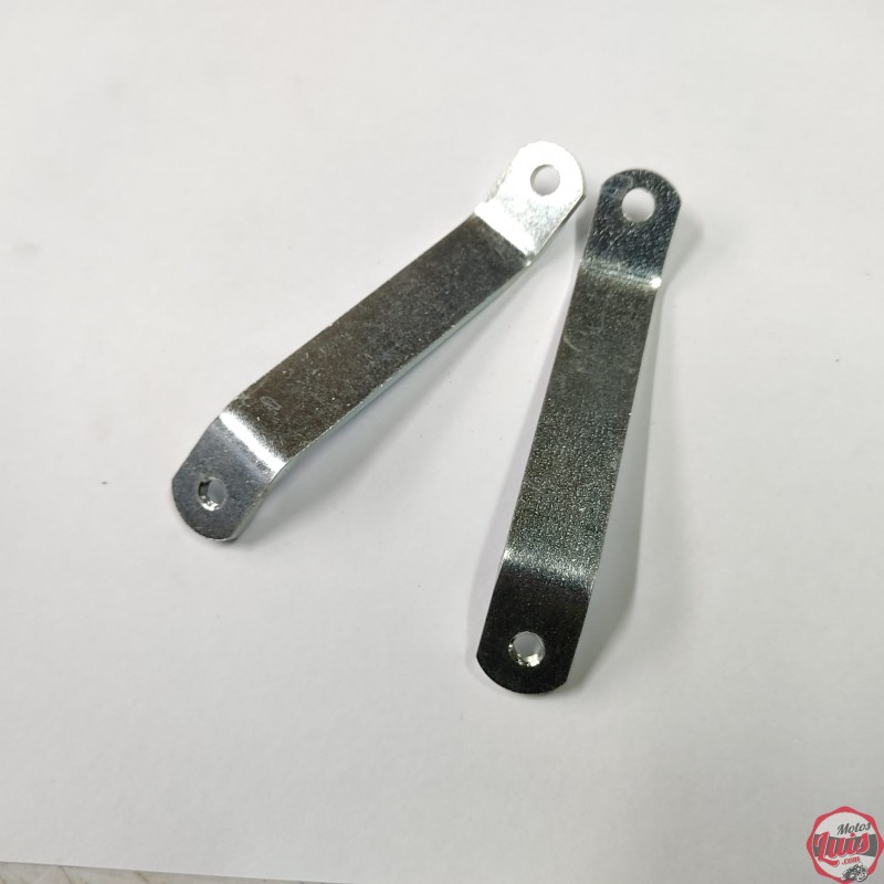Juego de 2 soportes de careta de faro para Bultaco Frontera, van colocados en la tija inferior y la careta de faro se sujeta con dos gomas que se clavan a los pinchos que sobresalen. El anclaje de la careta en la parte superior se hace sobre el soporte de cuentakilometros. Precio por la pareja