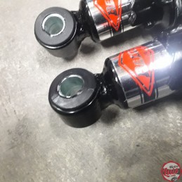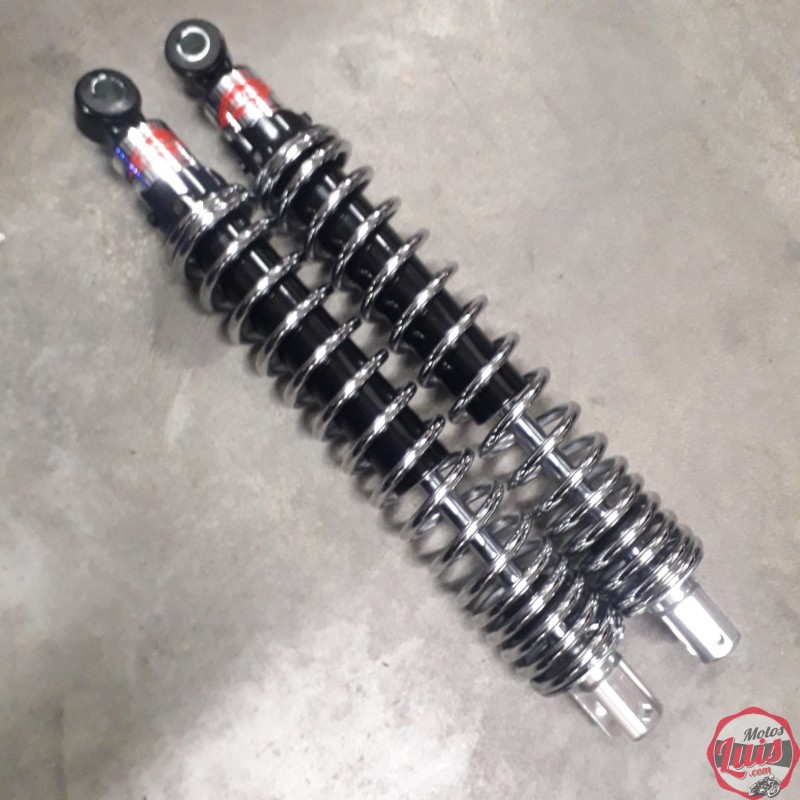 Juego de amortiguadores para Montesa Cota 330 y similares, con fijacion convencional en su parte superior y fijacion por horquilla en forma de "U" en la parte inferior. Acabado negro con el muelle cromo. Mas informacion en caracteristicas de producto.